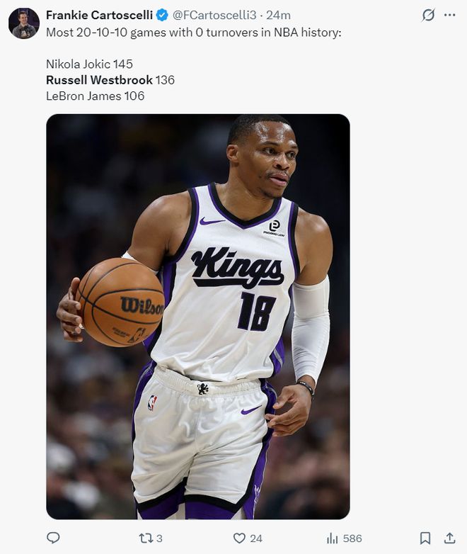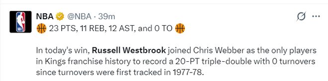 8.威少与韦伯一同成为国王队史唯二能拿到20+三双且0失误的球员。