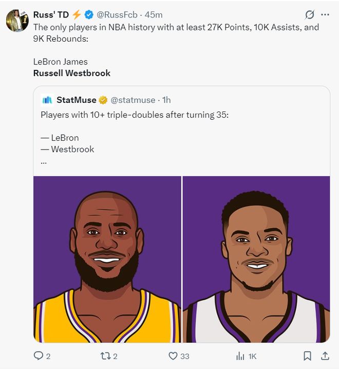 37岁威少又创8纪录!208三双夜与勒布朗争辉 国王想续约他有理