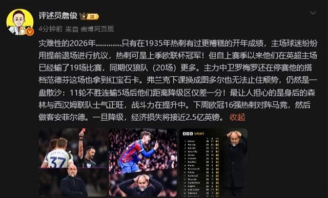“灾难性的2026年..............只有在1935年热刺有过更糟糕的开年成绩,主场球迷纷纷用提前退场进行抗议,热刺可是上季欧联杯冠军!但自上赛季以来他们在英超主场已经输了19场比赛,同期仅狼队(20场)更多。”